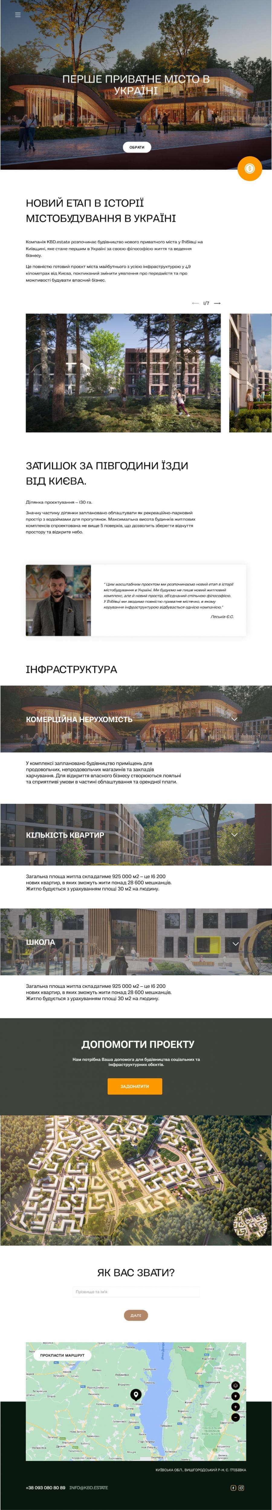 Розробка сайту для першого приватного міста неподалік Києва. Розробити адаптивний дизайн на основі сучасних технологій. Добавлення більше 1200 обєктів, реалізувати оплату та можливість залишити донат. Реалізувати інтерактивну карту для вибору дому - повер